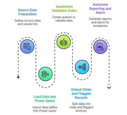 Import invoice and vendor data tables within Power Query in Excel or Power BI. - Step 3: Implement Validation Rules